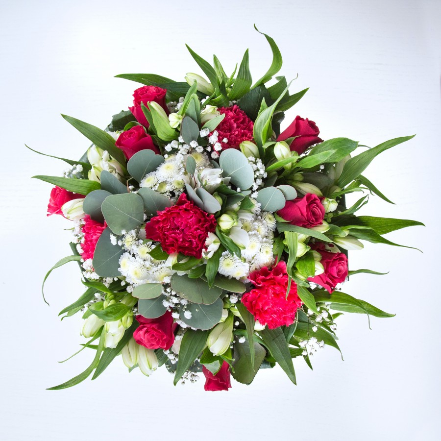 Immerse yourself in the blossoming delight of our Blossoming Delight Bouquet. This vibrant arrangement showcases lush red roses and delightful carnations, artfully mixed with pure white chrysanthemums and delicate gypsophila. Accented by white alstroemeria and rich aspidistra leaves, each flower is hand-selected to ensure exceptional freshness and quality.